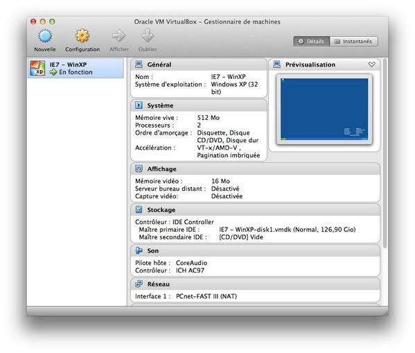 Me v’la bien, j’ai une VM Windows qui se lance dans VirtualBox, je vois la prévisu, mais aucune « vraie » fenêtre !