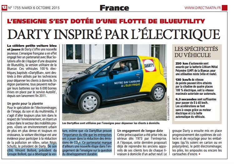 : Demi-page de branlette sur la voiture de Bolloré dans le journal de Bolloré avec l'interview de Bolloré.